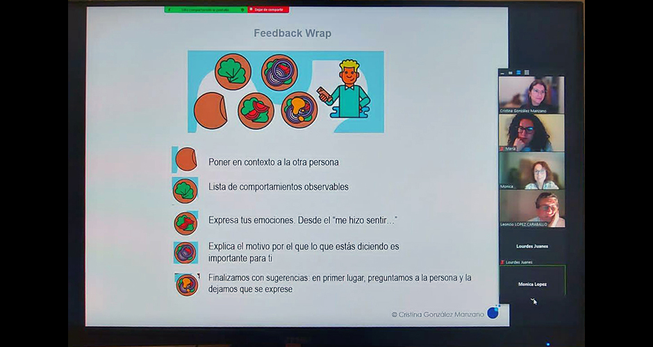 - Y pasamos a ver otra herramienta de Feedback, y a aprender cómo dar un feedback a nuestr@s colaborador@s y compañer@s de una forma diferente, con el Feedback Wrap. A través de varios pasos, los miembros de un equipo comparten sus comentarios de una forma constructiva y personal. Incluir nuestros sentimientos y el valor que tienen para nosotr@s, y permite empatizar con la persona que te ha dado el feedback, y a su vez preguntar y sugerir, ayudan a eliminar juicios y suposiciones.